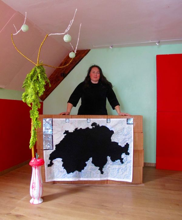 bestickte Schweizer Landkarte (84 x 123 cm), isl ndische Schafwolle, kanadisches Glanzpapier, Backsteine, Ösen, Nägel,