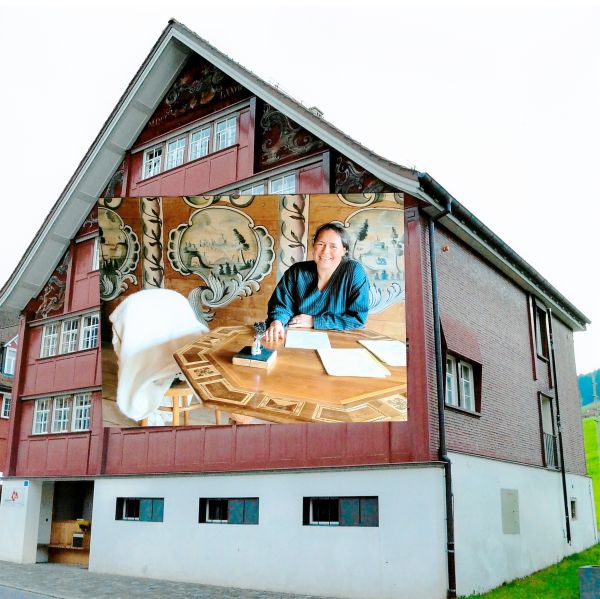 Selbstportrait mit dem Islandkleid vor dem ROOTHUUS in Gonten / 2016