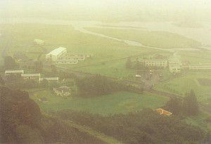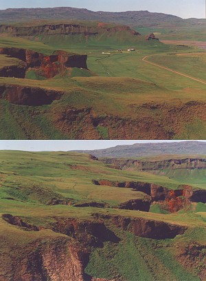 kirkjubaejarklaustur liegt am fusse einer ehemaligen steilküste. oben auf den alten küstenklippen erstreckt sich ein weites weidegebiet. |