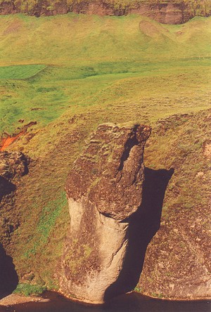systrstapi (schwesternfels) - befindet sich westlich des dorfes neben der skaftá. man erzählt - das oben auf dem felsen zwei gräber von nonnen sind - die wegen ihrer - unzucht - auf dem scheiterhaufen verbrannt wurden. die eine hatte sich dem satan verkauft, hostien an die tiere verfüttert und sich männern hingegeben. die andere hatte schlecht über den papst gesprochen. diese wurde nach der reformation für unschuldig gesprochen - auf ihrem grab wuchsen danach wunderbare pflanzen. das grab der anderen aber blieb unbewachsen. |