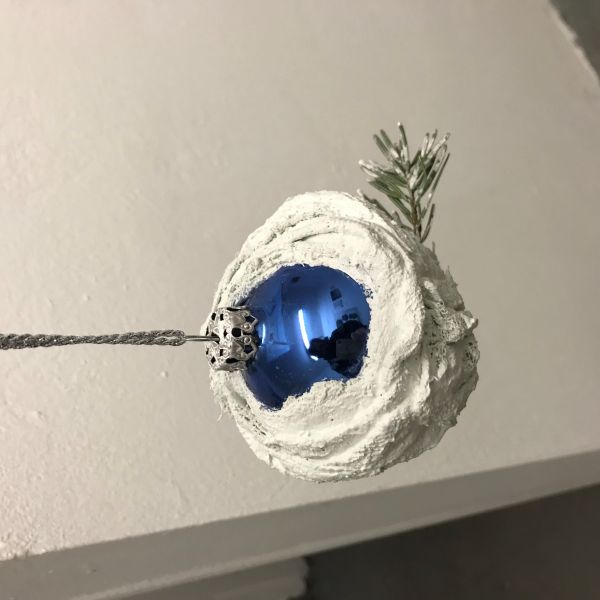 Weihnachten ist immer, eine Behausung f r den Heiligen Geist, 2013 / 16, Knetmasse, Holzst ckchen, Plexiglas, Aststück, Weihnachtskugel & Ast eines Weihnachtsbaumes