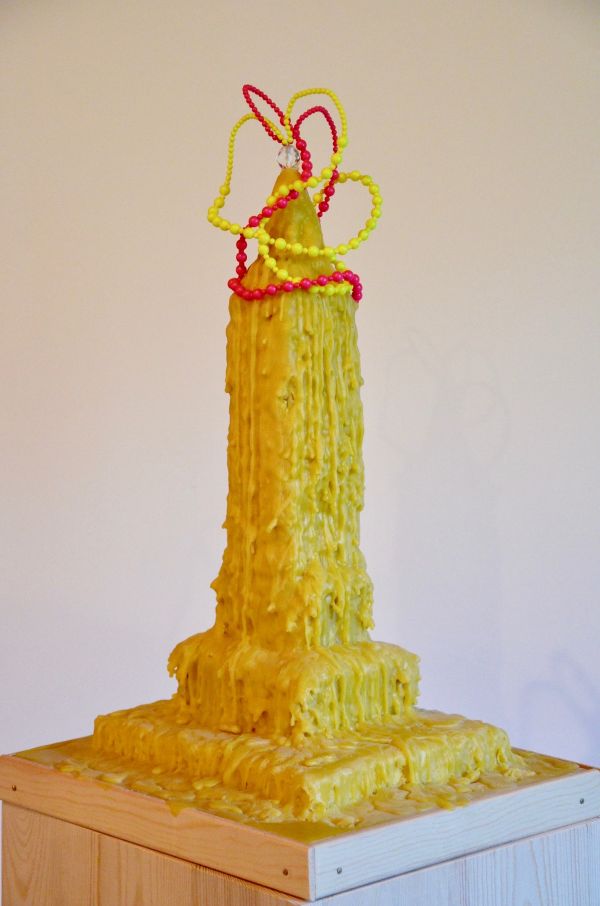 vertebra by vertebra in Little Italy, 2018, gegossene Formen aus Eisbecher, mit Neon-Buntstiften überzeichnet, Holz, Filz, Treibgut aus der Elbe, zerstückelte Eisbecher-Splitter, eine Backform, Moltofil, ein schwarzes Quadrat, Thermoblöcke, ein Pfeil, Detailansicht